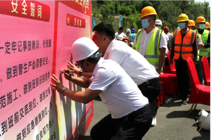 全體人員進(jìn)行安全承諾宣誓并在背景墻簽字承諾。