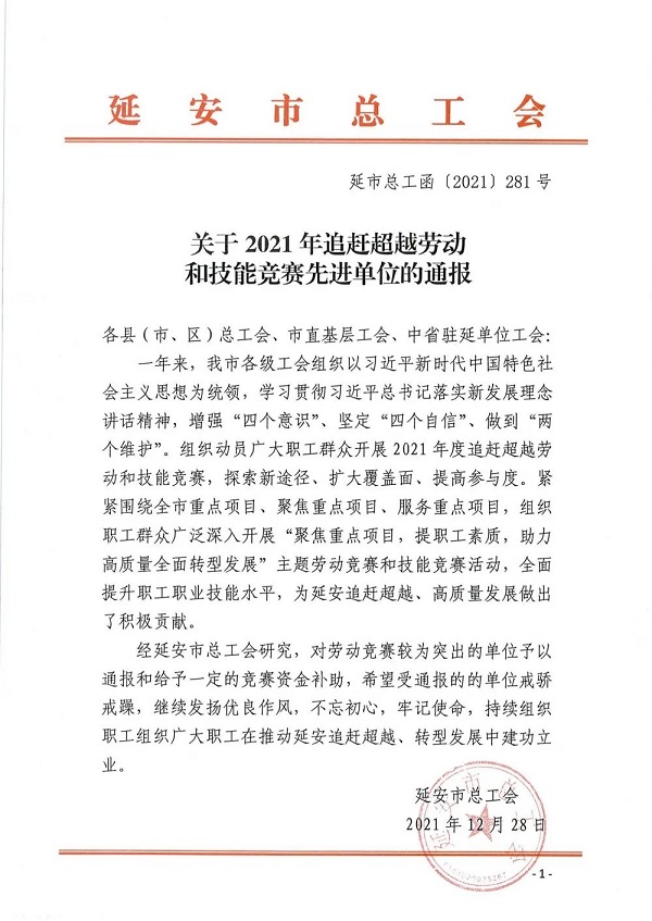近日,延安市總工會(huì)公布了2021年追趕超越勞動(dòng)和技能競(jìng)賽先進(jìn)單位名單。陜建十三建集團(tuán)榮獲延安市2021年追趕超越勞動(dòng)和技能競(jìng)賽先進(jìn)單位。